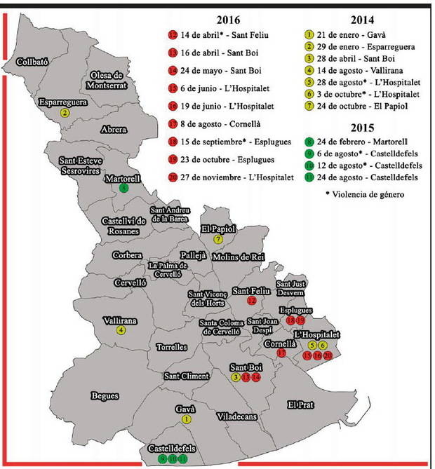 Echando la vista atrás, en el Baix Llobregat y L’Hospitalet se produjeron un total de nueve casos de homicidios en el año 2016 (seis en el ámbito geográfico de la comarca y tres en L’Hospitalet). Esto representa un aumento de cinco casos respecto al año 2015 (hubo cuatro homicidios en el Baix y ninguno en L’Hospitalet) y de dos en comparación con 2014 (cinco en el Baix y dos en L’Hospitalet). Datos negativos pese a lo bien que comenzó el año. Y es que, el primer homicidio se dio el 14 de abril, en Sant Feliu de Llobregat, cuando un hombre mató a tiros a su pareja en un nuevo caso de violencia de género, para después suicidarse. Caso especialmente sonado, puesto que el agresor era agente de la policía catalana. Dos días después, trascendía la sorprendente muerte de una niña de cuatro años a manos de su madre, en Sant Boi, que sufría problemas psicológicos y que, de hecho, acabó ingresada en el psiquiátrico de la ciudad.
