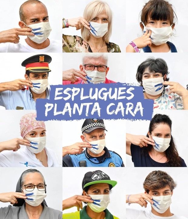 El Ayuntamiento de Esplugues ha lanzado la campaña ‘Esplugues planta cara’ con el objetivo de concienciar a la ciudadanía sobre la importancia del uso de la mascarilla para evitar nuevos rebrotes del covid-19. La iniciativa municipal, pensada para su distribución en redes sociales, está basada en fotografías en las que aparece un personaje con una mascarilla blanca con dos rayas azules pintadas como señal simbólica de guerra contra el coronavirus.