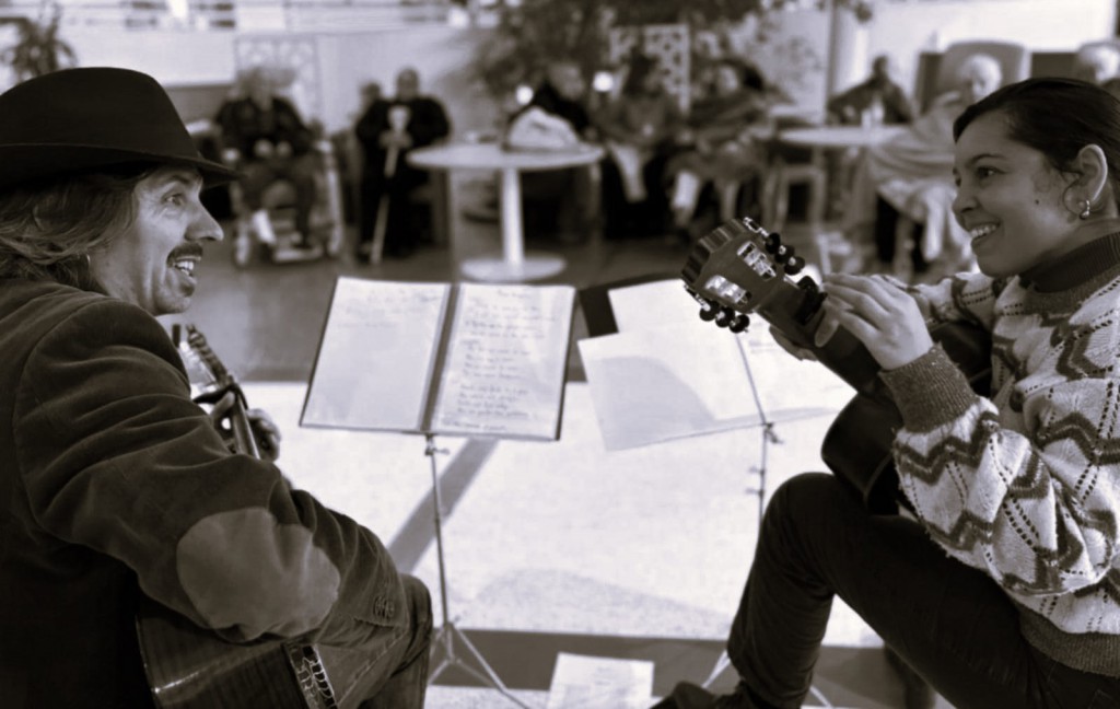 “Consiste en buscar, a través de la música en vivo, un instrumento de comunicación y cohesión social. Siempre desde los saberes de las propias personas mayores con las que trabajamos, codo con codo, en centros y consejos de salud, instituciones, gobiernos municipales, autonómicos, asociaciones, fundaciones, bibliotecas, centros cívicos y culturales”, admite Alejandro, que ha llevado su arte por todos los rincones del mundo para mantener vivos los vínculos entre las personas mayores a través de un repertorio que va más allá de las diferentes culturas: “Hay algo más que composiciones y ritmos. Hay memoria, dignidad, escucha, consuelo y resistencia”. Para ello, Alejandro acude a los hogares de personas con problemas de movilidad, de accesibilidad, o con dificultades para mantener su red social. “Así nos lo piden sus familiares. Ponemos especial hincapié en la escucha al otro, en el diálogo igualitario, en la relación interpersonal, yendo más allá del hecho sonoro”, destaca el artista sobre un proyecto con un fuerte impacto en La Rioja, Aragón, Asturias, Galicia, País Vasco, Cantabria, Castilla y León o Navarra, entre otros puntos de España.