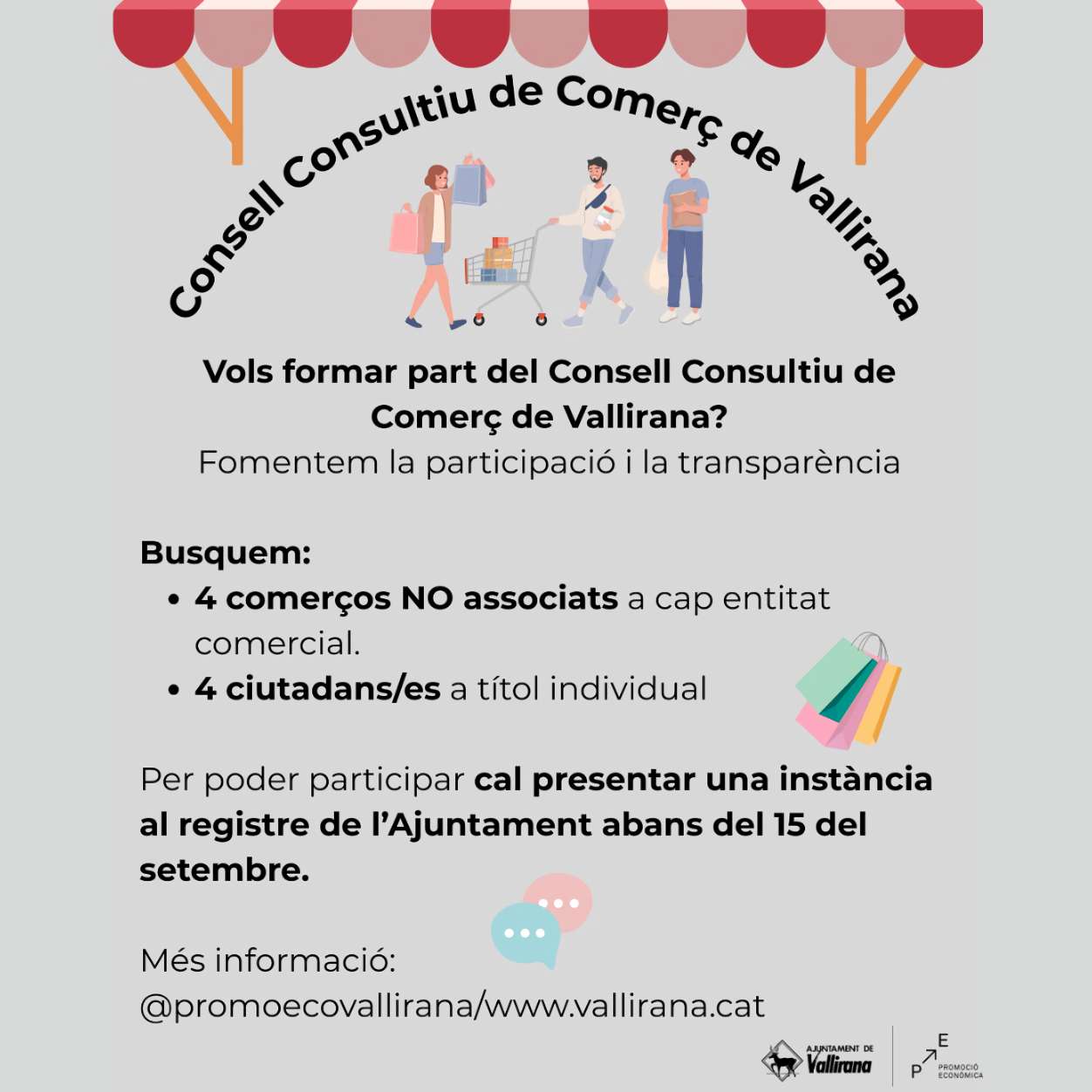 Se han destinado cuatro plazas para cada uno de estos colectivos. Los interesados tienen hasta el 15 de septiembre para presentar su solicitud mediante una instancia general del Ajuntament de Vallirana, especificando en el asunto “Consell Consultiu de Comerç”. En caso de que haya más solicitantes que plazas disponibles, se llevará a cabo un sorteo basado en el número de registro de entrada, es decir, por orden de presentación.