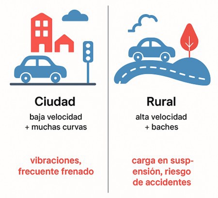 Los principales desafíos de las vías urbanas son la presencia de zonas peatonales y aceras, semáforos y límites de velocidad estrictos. Esto provoca frenadas frecuentes, vibraciones debido a superficies irregulares y una mayor carga en la suspensión. Los problemas de las vías rurales e interurbanas son los baches, las grietas y la conducción a altas velocidades. Esto provoca una tensión significativa en los amortiguadores, aumenta el desgaste de la suspensión y crea el riesgo de perder el control del vehículo.