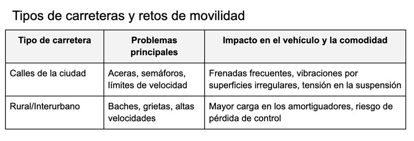 La tabla anterior muestra los diferentes tipos de carreteras que encuentran los conductores y destaca los principales problemas y su impacto en el vehículo y la comodidad de conducción.