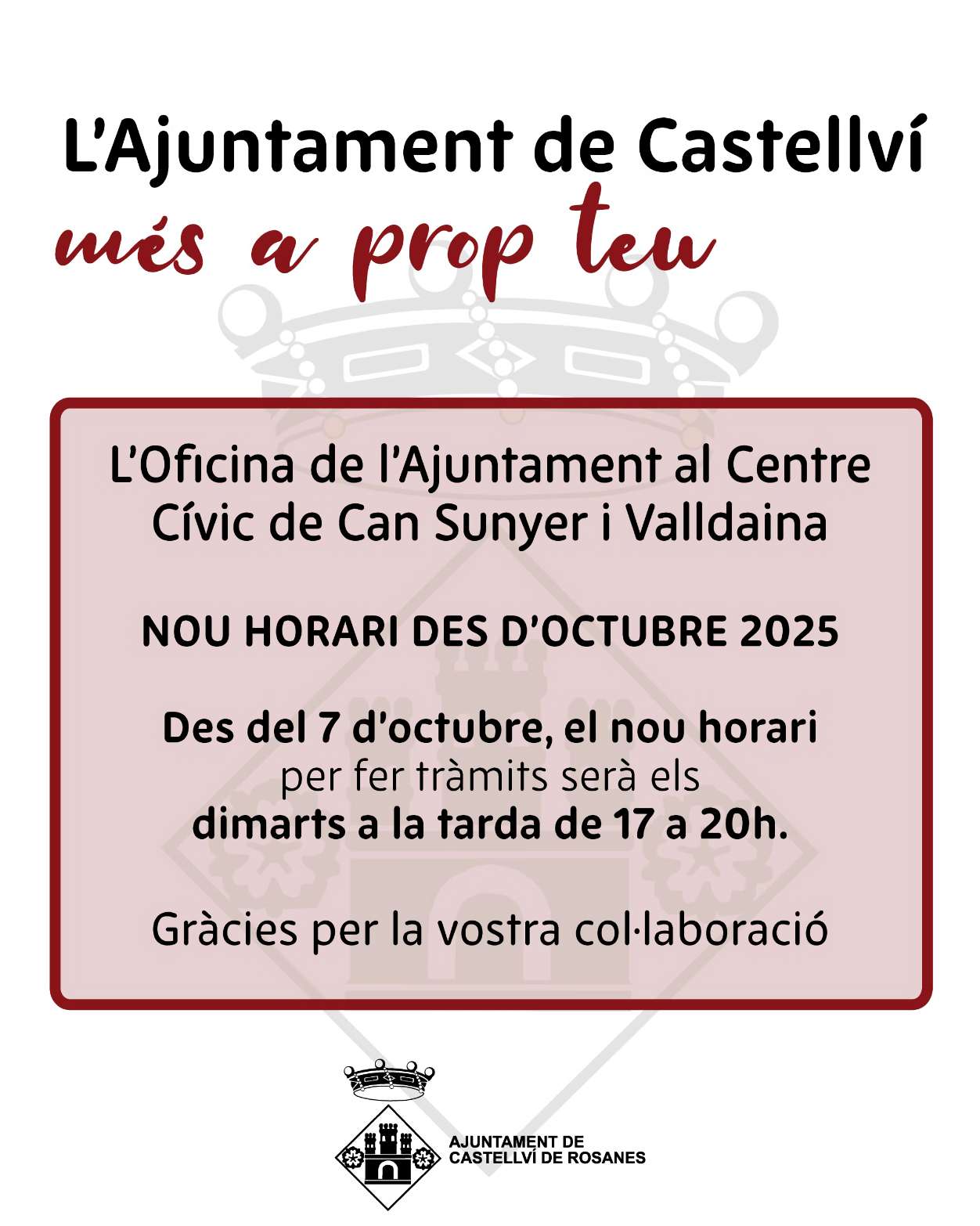 El servicio de atención presencial para trámites municipales en el Centre Cívic de Can Sunyer y Valldaina ha modificado su horario a partir de este octubre. A partir de ahora, la oficina abrirá los martes de 17:00 a 20:00 horas. Durante este tiempo, cualquier persona que necesite realizar un trámite con el Ajuntament podrá acercarse al centro cívico y será atendida personalmente.