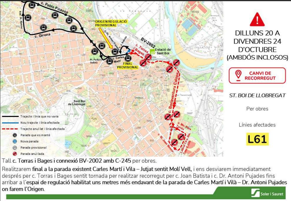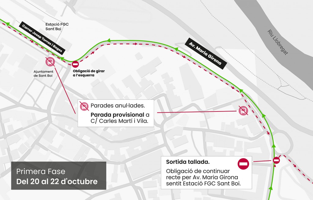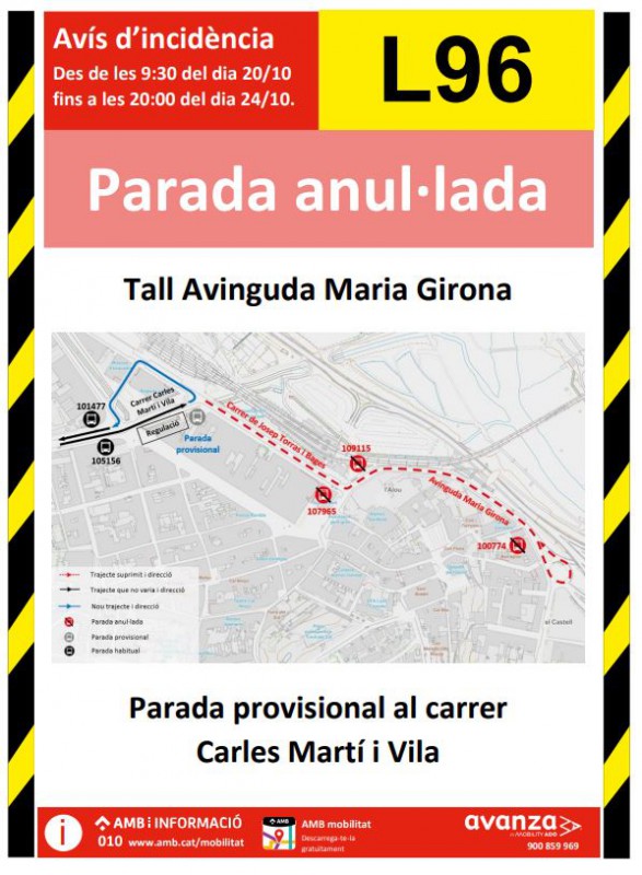 • Se anulan las paradas habituales en Josep Torras i Bages y Av. Maria Girona; como alternativa se habilitará una parada provisional en la calle Carles Martí.