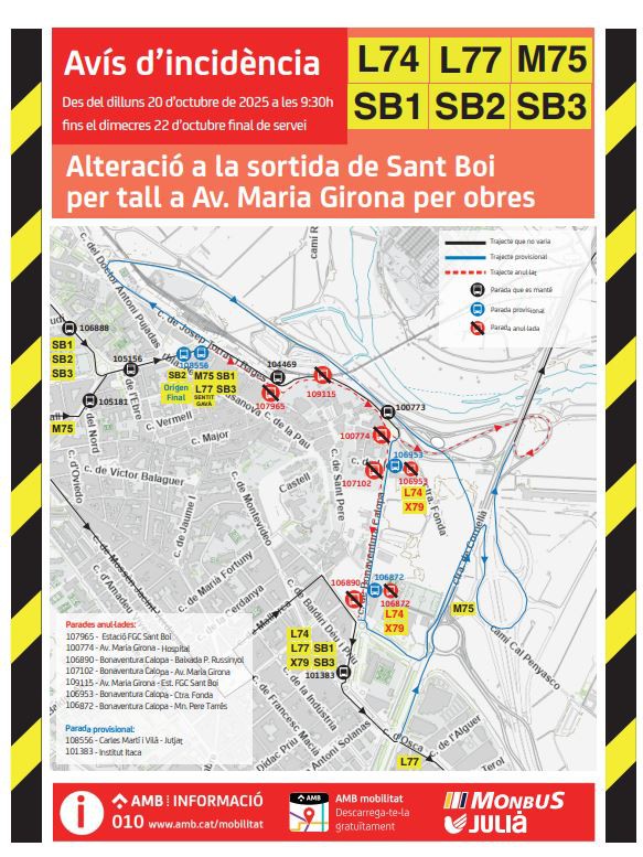 • Todas las paradas de Josep Torras i Bages y Av. Maria Girona en ambos sentidos (L96, L77, L61, M75, SB1, SB2 y SB3C) quedarán anuladas.