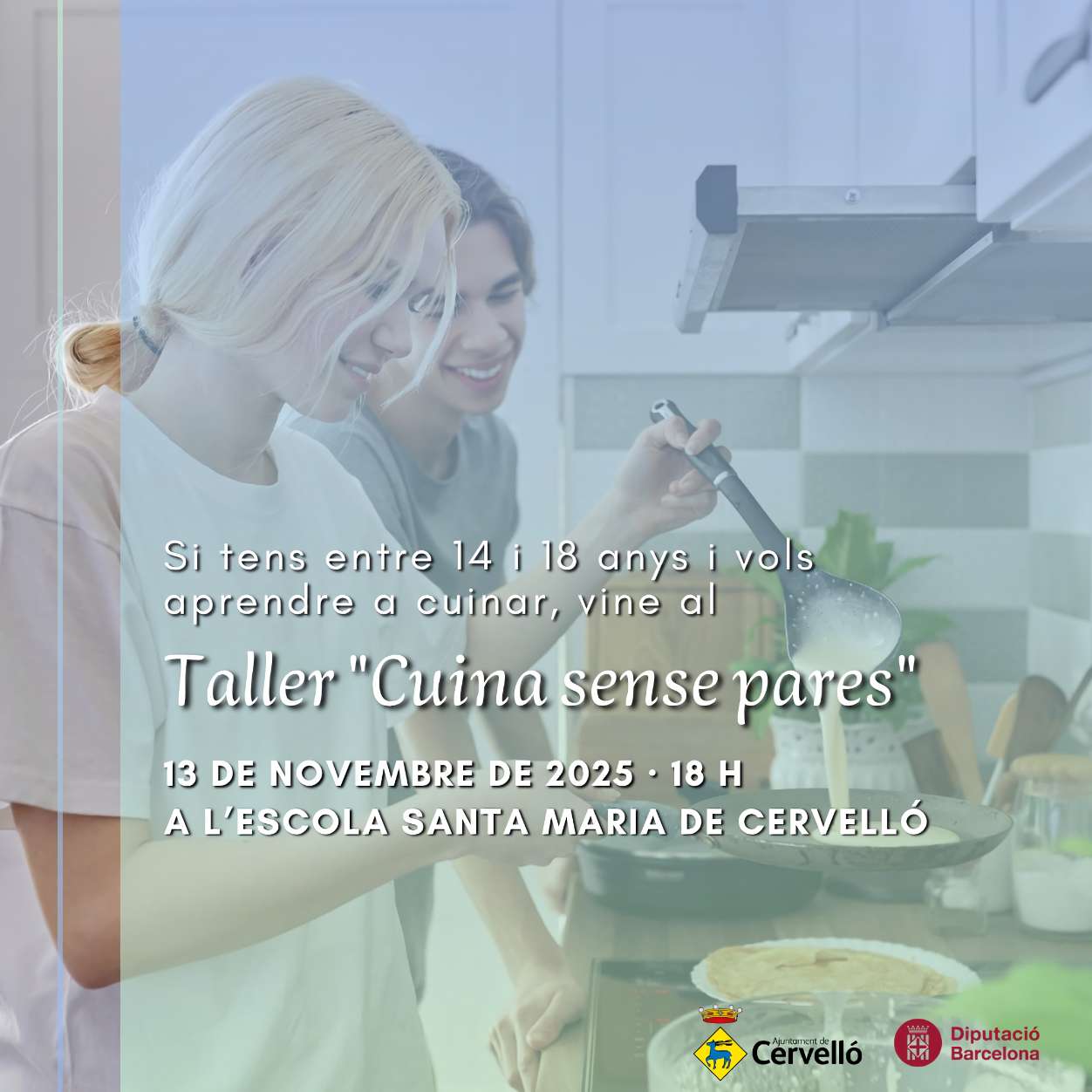 El Ajuntament de Cervelló ha abierto las inscripciones para el taller "Cuina sense pares", dirigido a jóvenes de 14 a 18 años. La actividad, que se llevará a cabo el 13 de noviembre en la Escuela Santa María, tiene como objetivo enseñar a los participantes a preparar platos sencillos y saludables.