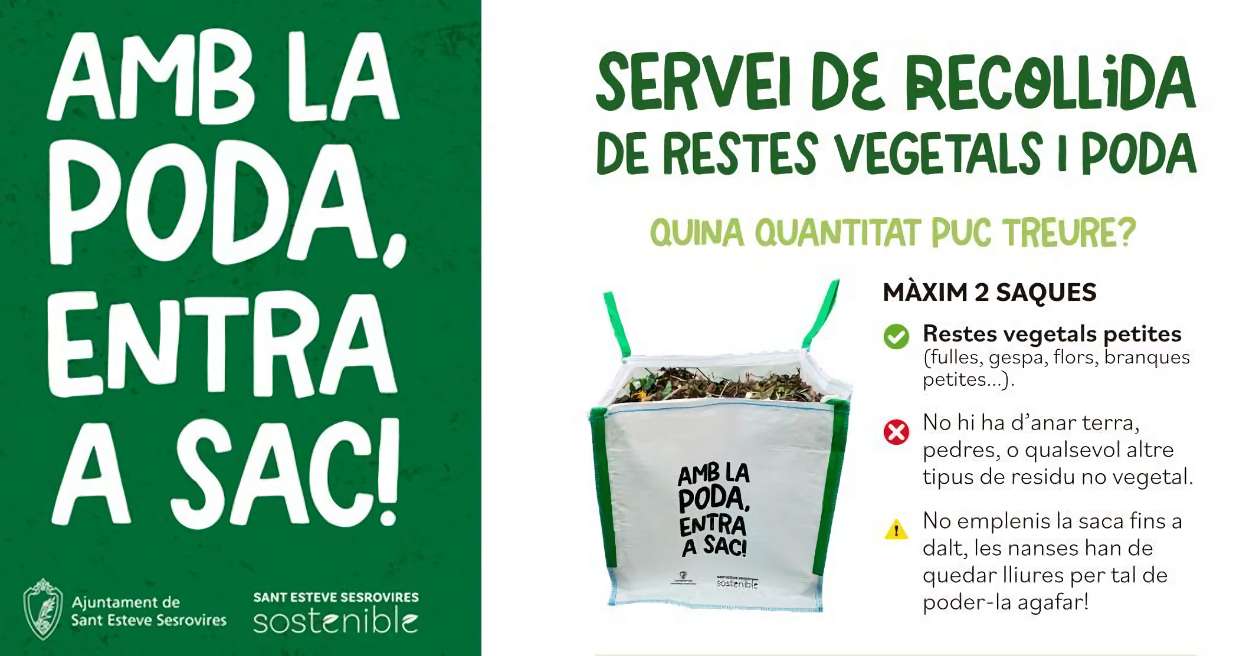El Ayuntamiento de Sant Esteve Sesrovires ha anunciado cambios significativos en el servicio de recogida de poda, que entrarán en vigor el próximo 3 de noviembre. A partir de esa fecha, se incrementará el número de saques permitidos, pasando de una a dos por usuario. Además, los días habilitados para la recogida serán los lunes, martes y jueves, lo que permitirá mejorar la eficiencia del servicio.