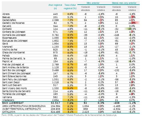 El Baix Llobregat ha cerrado este pasado mes octubre con 32.517 personas registradas en paro, lo que sitúa la tasa de desempleo en el 7,8%, según datos hechos públicos por el Observatori Comarcal del Baix Llobregat. La cifra representa una ligera mejora respecto a septiembre (-0,3%) y una reducción más significativa en comparación con el mismo mes del año pasado (-1,2%). Aun así, la comarca mantiene un comportamiento mejor que la media del área metropolitana (que se ha fijado en un 8,2%) y del global de toda Cataluñao (8,1%).