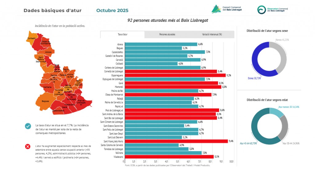 No obstante, los datos de desempleo hechos públicos este jueves por el Observatori Comarcal del Baix Llobregat revelan que este mes de octubre ha dejado un ligero aumento del paro en la comarca, con 92 personas más inscritas en las listas del Servicio Público de Empleo. En total, la comarca cierra el mes con 32.517 personas desempleadas, aunque la cifra sigue siendo inferior a la del año pasado, con un descenso del 1,2% respecto a octubre de 2024 (408 personas menos). La tasa de paro en la comarca se sitúa en el 7,7%, por debajo de la media catalana, lo que mantiene al Baix Llobregat entre los territorios con mejor comportamiento del mercado laboral.