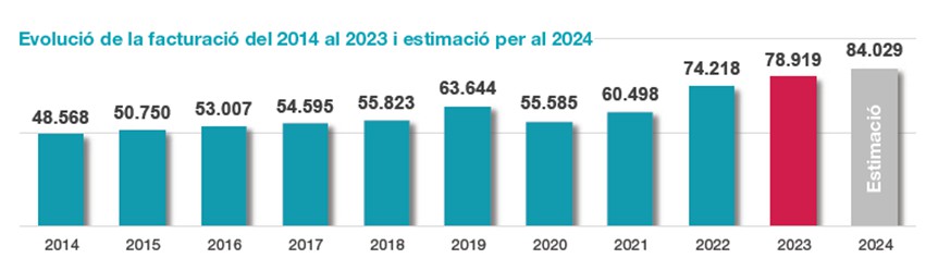 En el conjunto de la provincia de Barcelona, las empresas han facturado en 2023 367.078 millones de euros, un 5,3% más que el año anterior y lo que arroja un 38% de incremento respecto a 2014. Con los datosw preliminares de 2024 todavía en análisis, el estudio estima que la cifra de facturación ascenderá hasta los 390.563 millones, lo que supondría otro avance del 6,4%.