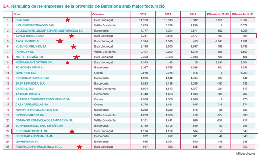 Según el informe de Canals y Culleré, el Baix Llobregat se mantiene como la segunda comarca con mayor facturación de toda la provincia, solo por detrás del capitalino Barcelonès, (que incluye, no olvidemos, al efervescente L'Hospitalet) y destaca especialmente en el sector industrial. Buena parte de este impulso se explica por el peso de SEAT, cuya sede en Martorell sitúa a la compañía automotriz como la empresa que más factura de la provincia: 14.169 millones de euros en 2023, muy por encima de los 10.513 millones registrados en 2022.