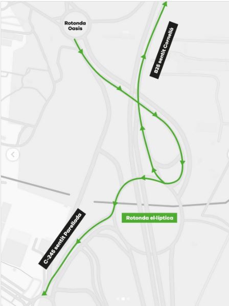 • Se habilita una salida alternativa algo más enrevesada que la actual desde la rotonda del Oasis para quienes se dirijan al sector de la Parellada o a la C-245 hacia Viladecans. Hasta ahora se accedía a la C-245 por un carril provisional, que será cerrado para perfilar el enlace definitivo. Mientras tanto, los conductores deberán tomar el mismo ramal que conectará con el ramal pero en la rotonda elípcitico deberán tomar la segunda salida, que estará perfectamente señalizada, por la que volverá a accederse al tronco central de la C-245 y la 'nueva' rotonda de la Parellada.