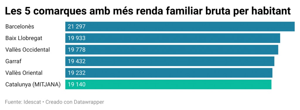 Tanmateix, si ens fixem en la renda familiar bruta per habitant observem que, en efecte, existeix una concentració d’ingressos, preimpostos, a l’àrea metropolitana de Barcelona. Segons dades d’Idescat, les cinc comarques catalanes amb una renda familiar bruta per habitant més elevada són el Barcelonès, amb 21.297 euros de mitjana, seguit del Baix Llobregat, que assoleix els 19.933 euros, i el Vallès Occidental amb 19.778 euros. Finalment, trobem el Garraf que compta amb 19.432 euros de mitjana i el Vallès Oriental, amb 19.232 euros. Cinc comarques, a més, que superen la mitjana catalana.