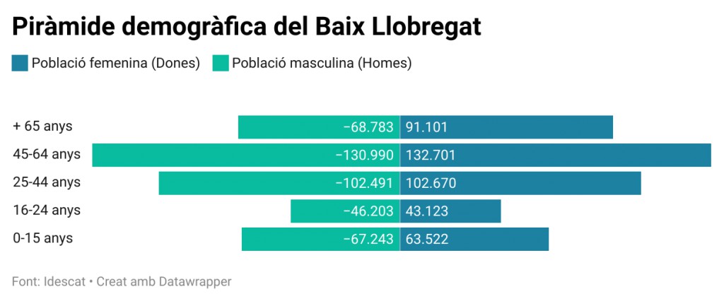 El Baix Llobregat tanca l’any 2025 com la tercera comarca amb més densitat de població de Catalunya, només per darrere del Barcelonès i el Vallès Occidental. N’hi viuen 848.827, segons les dades més recents de l’Idescat. Així, la distribució per edats mostra un patró similar al de la resta del país, amb una piràmide demogràfica cada cop més invertida. El padró del 2024 ja evidenciava aquesta tendència: la població de seixanta-cinc anys o més ascendeix a 159.884 persones, l’equivalent al 18,8% del total. Tot i això, la base productiva és sòlida, atès que la franja en edat de treballar (dels 16 als 64 anys) continua sent la majoritària, amb 568.787 persones, aproximadament el 67% de la població.