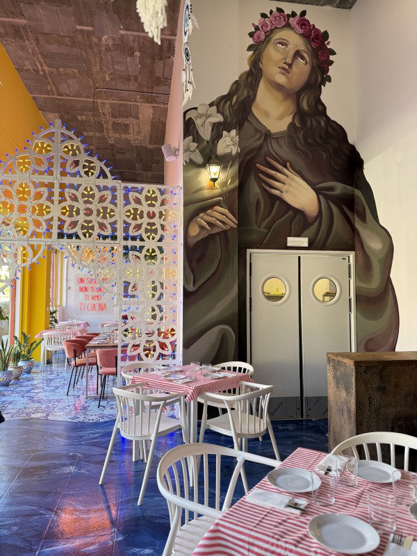El viaje sensorial del Bedda Madre empieza incluso antes de sentarse a la mesa. Stevanato lo resume con la naturalidad de quien tiene por virtud hacer lo complicado fácil: “También es una nueva forma de proponer la comida italiana, por ejemplo con la ambientación del local: la entrada desde la calle reproduce la entrada a un mercado italiano con sus típicos quitasueños. También hay un patio y una pérgola de una típica casa italiana”. Y es cierto: la entrada funciona como un pequeño torbellino siciliano. Hay color, hay simbolismo religioso (con imagenes de una madonna) y profano, hay guiños callejeros, hay artesanía. Tanto en la sala como en los lavabos que también son un icono casi pop.