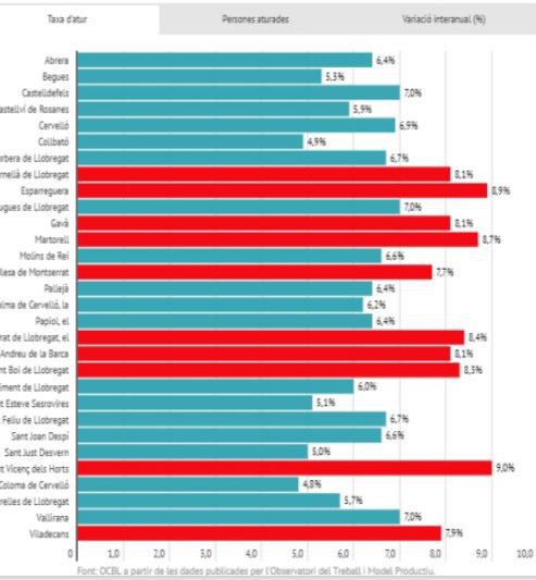 Si se analiza la situación municipio a municipio, los datos muestran una evolución desigual del desempleo durante noviembre. Entre los mejores resultados, destacan Collbató y Santa Coloma de Cervelló, donde el paro cayó un 13,1% y un 9,1% respectivamente, y Sant Climent de Llobregat, con un descenso del 8,8%. También cabe mencionar a Cornellà y Esplugues , con reducciones del 2,6% y 3,5%, lo que contribuye significativamente al descenso global de la comarca.