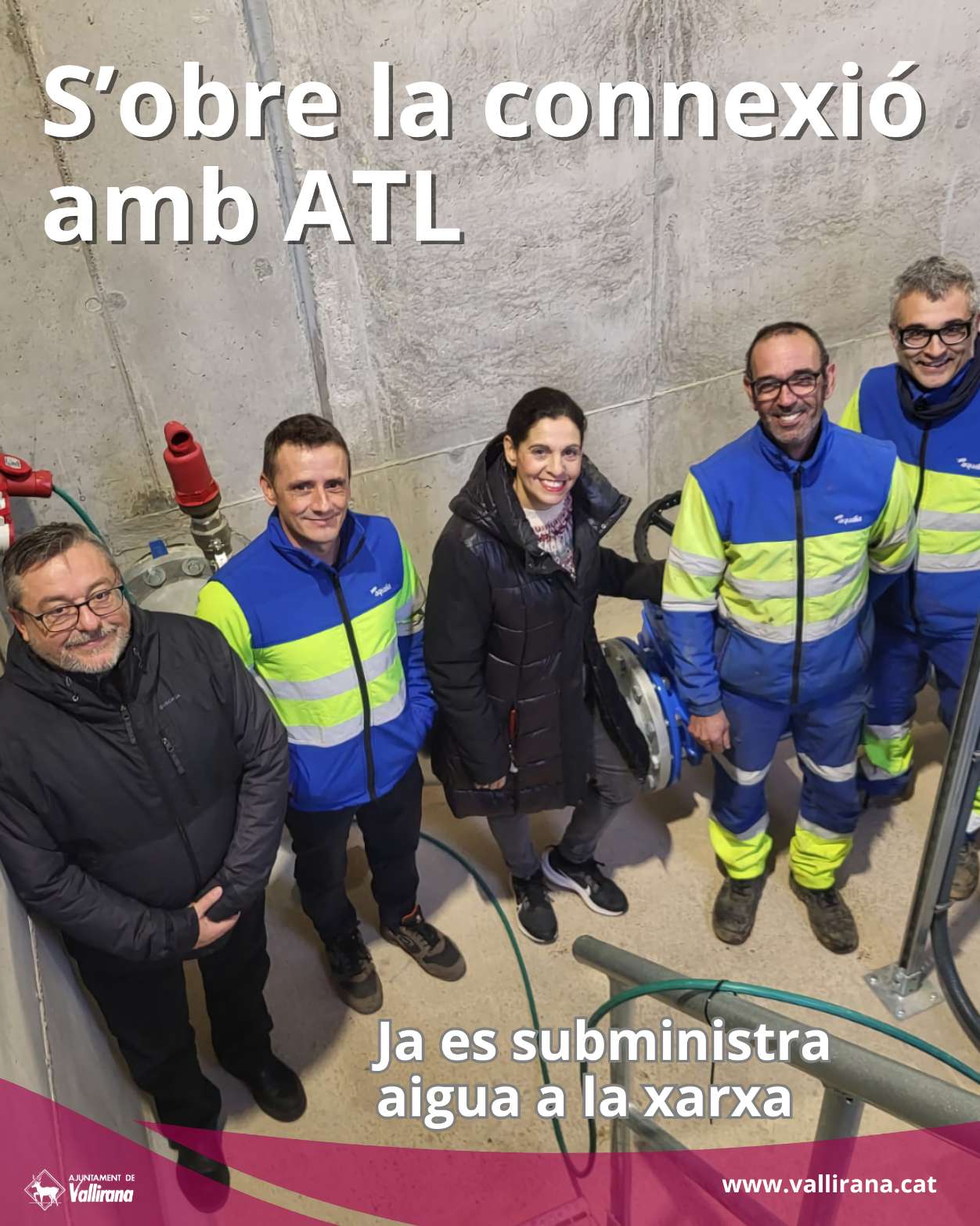 Este mañana ha comenzado a funcionar la conexión con Aigües Ter-Llobregat (ATL) desde el nuevo depósito, que ofrecerá servicio a la zona este del municipio, abarcando desde las Casetes hasta el centro urbano y los barrios adyacentes. Se espera que la próxima semana se pueda distribuir agua de ATL a todos los barrios de Vallirana.