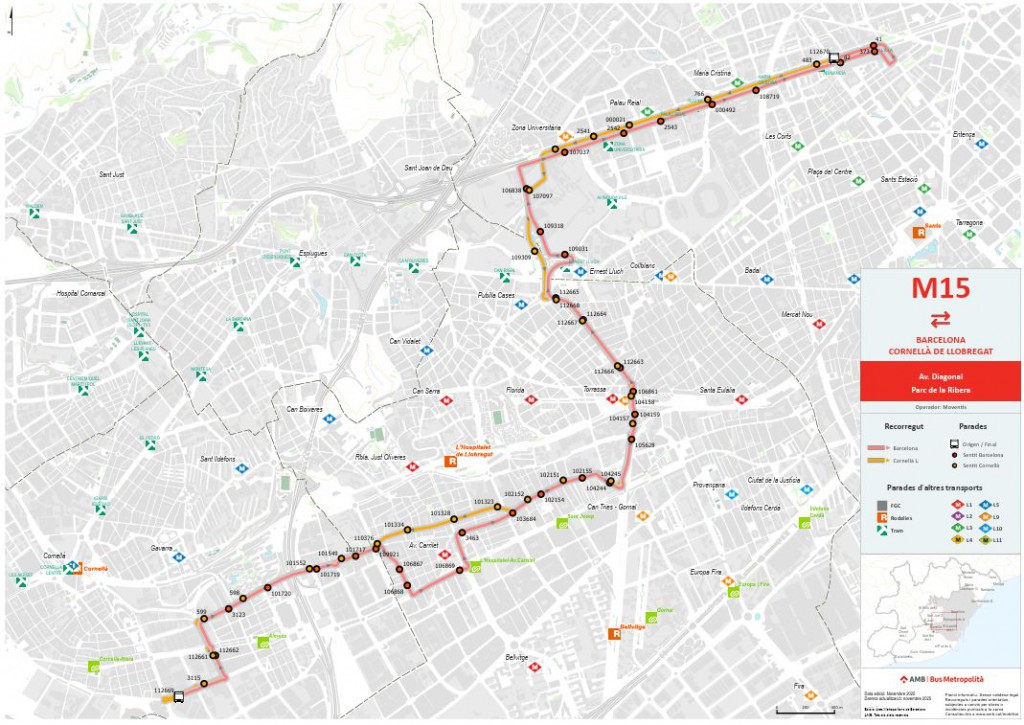 El M15 conectará la Zona Universitaria con la Illa Diagonal, atravesando L’Hospitalet y llegando hasta Cornellà de Llobregat, con paradas estratégicas pensadas para cubrir zonas densamente pobladas y puntos clave de actividad. En L’Hospitalet, la línea comparte un tramo con el M12 e incorpora nuevas paradas en el eje de la avenida del Torrent Gornal, lo que permitirá mejorar notablemente la cobertura en barrios como La Torrassa, Collblanc, la Florida y Pubilla Cases. Estos vecindarios ganan así una conexión directa tanto con el centro de L’Hospitalet como con la Diagonal barcelonesa.