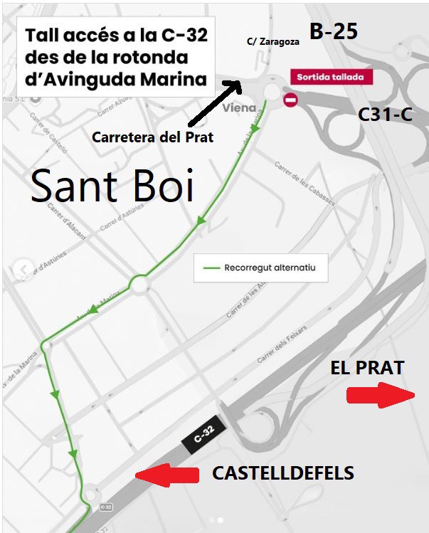 Desde el mediodía de este lunes está cerrada al tráfico la primera entrada a la autopista C-32 desde enl polígono Salines de Sant Boi en dirección a Castelldefels (la conocida como la rotonda del Viena) debido al avance de las obras de construcción de la B-25 que obligan a modificar este enlace para mejorar el acceso al tronco central de la autovía. Como alternativa, los conductores pueden continuar por la avenida Marina (B-201) y acceder a la autopista del Garraf por la siguiente entrada, situada en la prolongación de la Riera Roja.