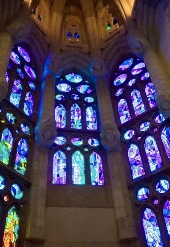 Dentro del templo, la luz atraviesa sus gigantescos vitrales y fluye lentamente en el aire. Un lado es rojo y naranja ardiente, como el sol mediterráneo fundiéndose en oro; el otro, azul y verde transparente, como el mar y las montañas al amanecer.