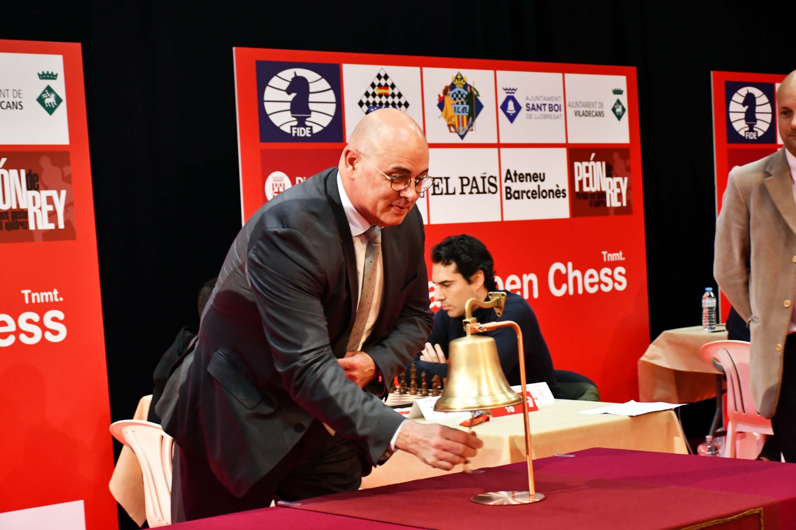 Jesús Lozano, CEO de la companyia de transport de mercaderies nacional i internacional Lotrans, ha visitat el IV El Llobregat Open Chess Tournament i ens ha honrat fent el toc de campana que dóna inici a la ronda de joc. Foto: Patricia Claros Aguilar (@Patriciaajedrez).