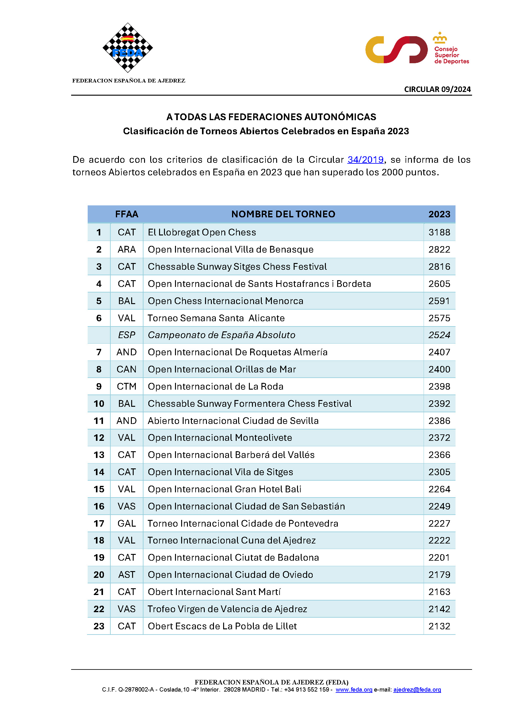 El Llobregat Open Chess ja va aconseguir la mateixa certificació l’any 2022 (enllaç directe a la web de la FEDA: https://feda.org/feda2k16/wp-content/uploads/C02_2023-Clasificacion-Torneos_Abiertos_2022.pdf ).